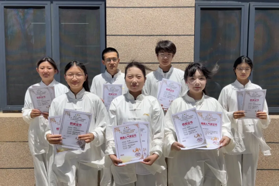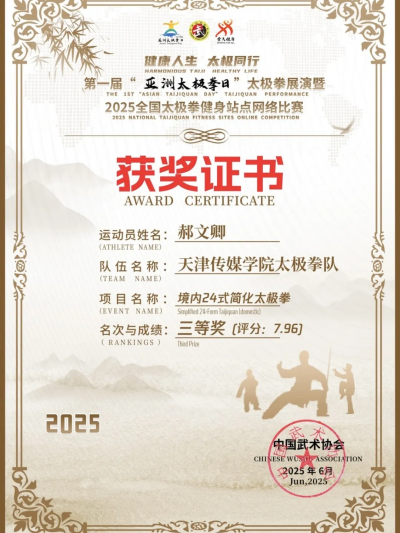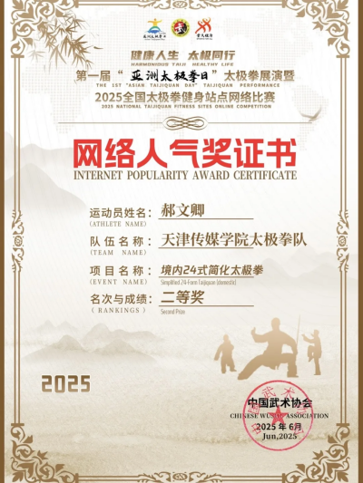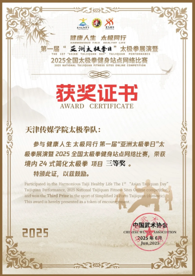 在首届“亚洲太极拳日”展演暨2025全国太极拳网络大赛中,天津传媒学院学校太极拳队凭借扎实功底与默契配合,一举斩获境内24式简化太极拳团体三等奖、网络人气奖团体二等奖,以及个人评分奖三等奖七项、网络人气奖二等奖七项,共十六个奖项,为校争光!