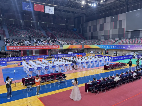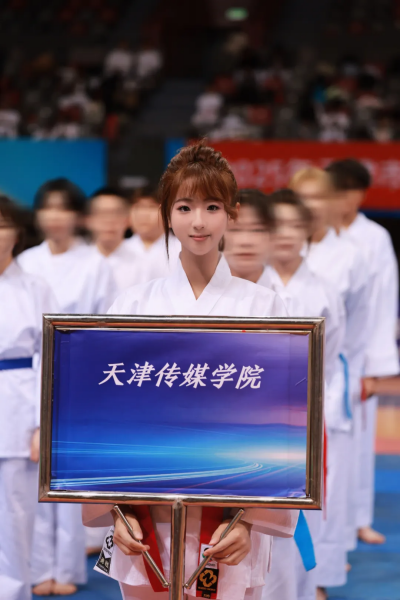 开幕式现场,气氛热烈而庄重。各高校代表队身着整齐的队服,迈着矫健的步伐依次入场,展示着各自的风采。天津传媒学院空手道队的队员们身姿挺拔,眼神坚定,彰显出他们对此次比赛的期待与决心。在激昂的音乐声中,现场观众的热情被点燃,掌声和欢呼声此起彼伏。