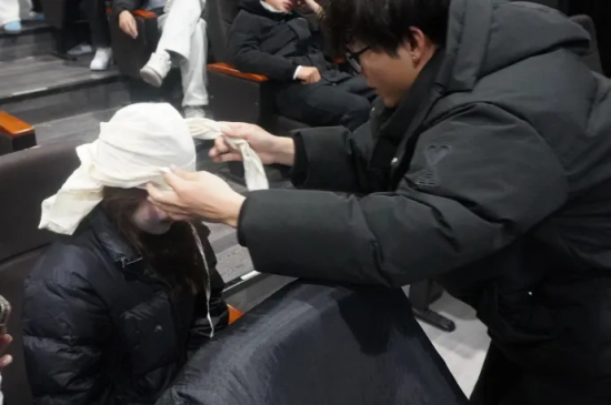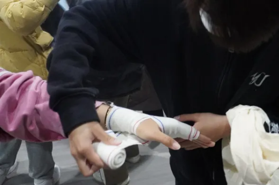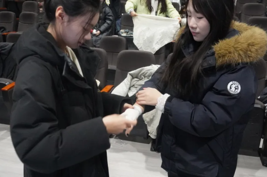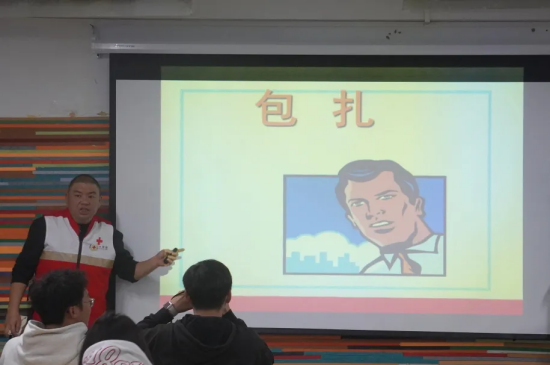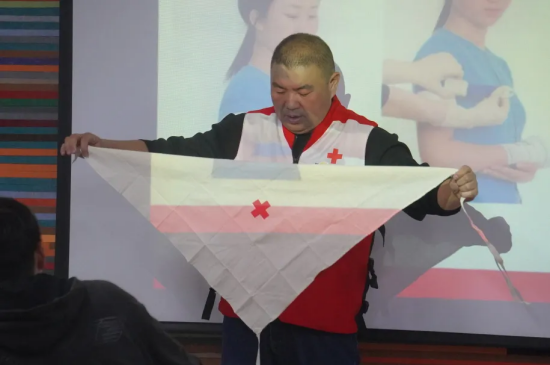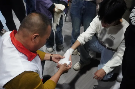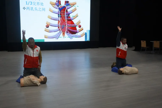 在示范与练习阶段,红十字会的工作人员的专业示范与严格指导和学员们认真听讲的学习态度共同促进了培训的顺利完成。