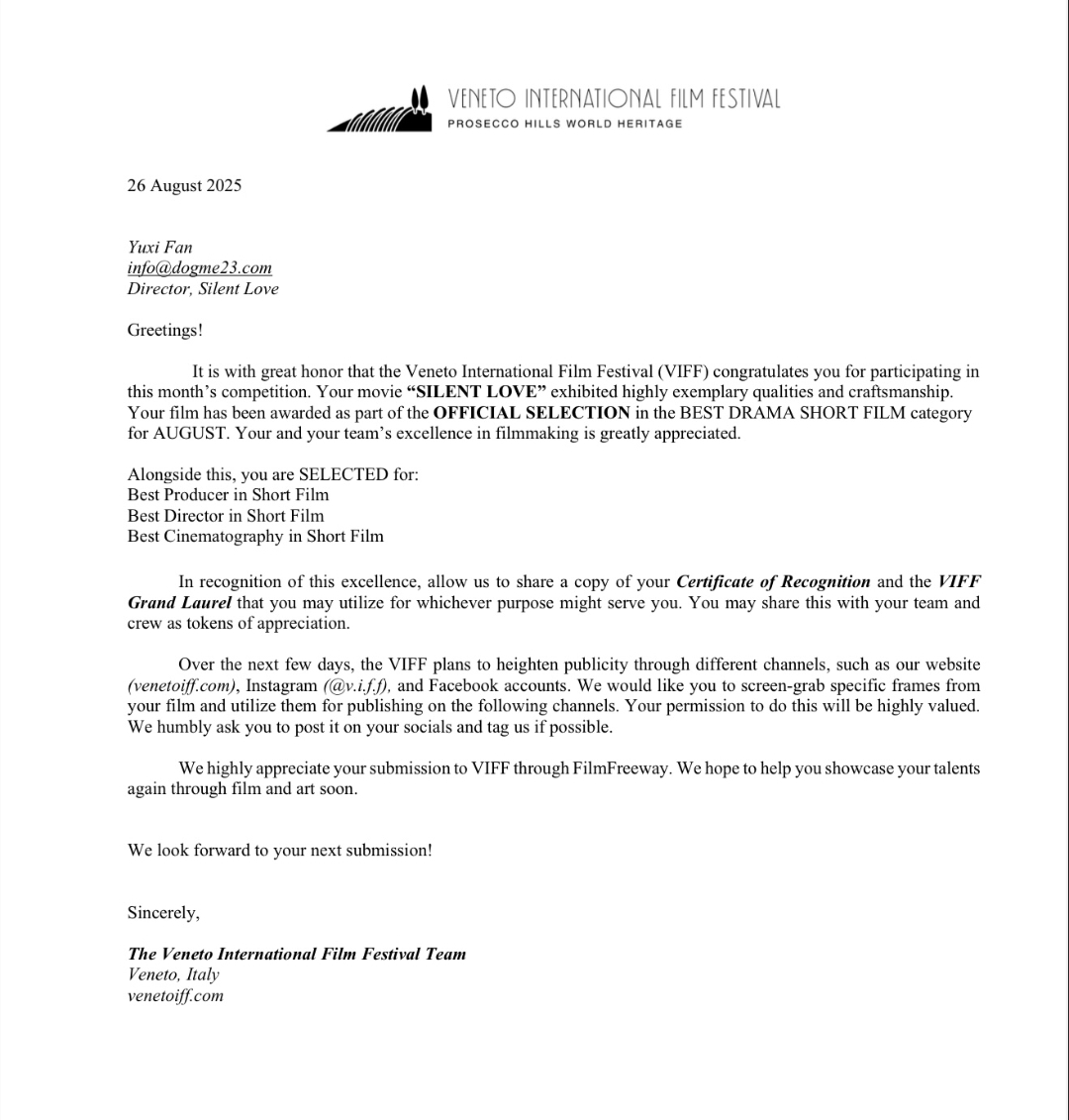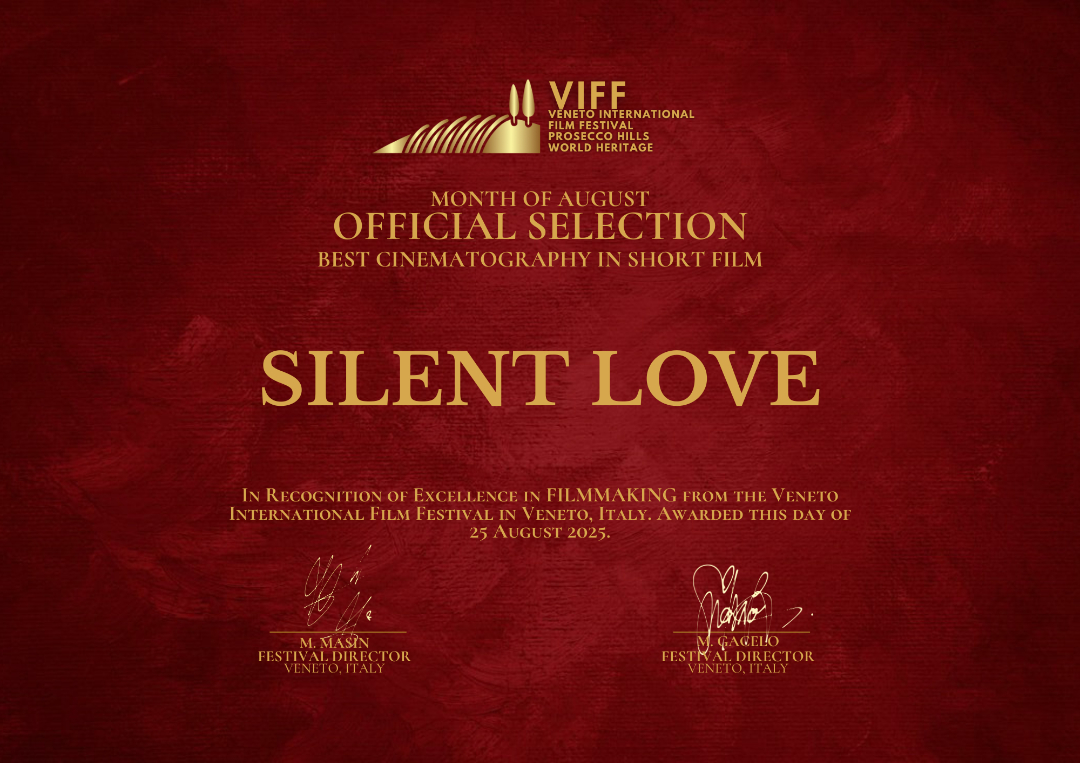 在威尼托国际电影节的评选中,《悄无声息》更是斩获“八月最佳剧情片”荣誉,并获得“最佳制作人”“最佳导演”“最佳摄影” 三项提名,充分展现了我校影视学院学子在影像叙事与视觉表达上的扎实功底与独特视角。目前,该作品仍在其他国际电影节的评选进程中,后续有望冲击更多奖项。