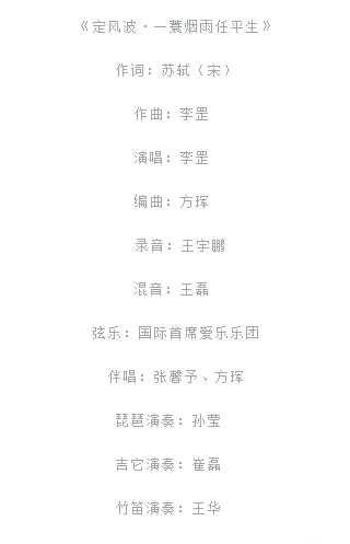 李罡校长全新谱曲的这首《定风波·一蓑烟雨任平生》正如苏轼的人生态度,肆意、洒脱,好不自在!作品中大鼓、琵琶有节奏的敲击,再加上流行音乐元素——电吉他的配器,听上去有种不惧风雨坎坷、旷达超逸的胸襟和超然情怀,充满清旷豪放之气,现代乐器与传统乐器的碰撞以及古词今语的表达,冥冥之中抒发了苏轼以及李罡校长自己不拘世事、我行我素的人生态度。