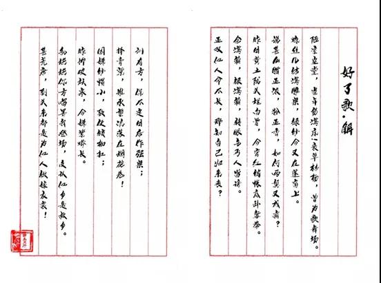 “乱烘烘你方唱罢我登场,反认他乡是故乡;甚荒唐,到头来都是为他人作嫁衣裳。”是曹雪芹《好了歌·解》中醒世的一句金句。为这首名篇谱曲,既要凸显原著愤世潇洒的特点,又保持原著的完整性,还要讲究歌曲的流畅度、传唱性以及兼顾好听等的特点,谱曲着实需见功底。选用曲艺元素加入以及极富中国国风乐思的表现手法其实与校长从小听戏、听民歌长大有关,与校长浸泡在传统文化中滋养成长有关。