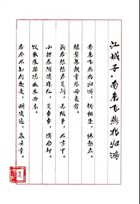 李罡校长《国风·2020》专辑中收录了这首《江城子·南来飞燕北归鸿》并进行谱曲,创作中采用流行元素并加入戏曲,京剧部分让这首歌意境更深远,有种古今对话的时空穿越感。